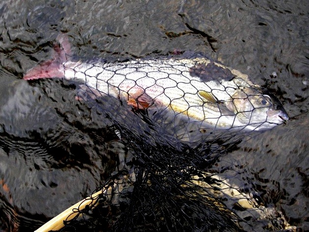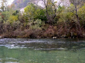 Am nächsten, meinem diesjährig letzten Angeltag in Kroatien griff ich wie zur Erholung zur leichten Fliegenrute und fischte eine Flussstrecke ab, von der ich wusste, dass sie starke Fische beherbergt und die mir eigentlich immer den Fang guter Exemplare ermöglicht hatte. Und auch dieses Mal enttäuschte sie mich nicht. So, als ob sie mir noch einen versöhnlichen Abschluss des Fischerjahres 2010 bereiten wolle, gewährte sie mir den Fang einer prächtigen Äsche, die mit 41 cm zu den stärksten zählte, die ich in der Kupa bisher überlisten konnte.