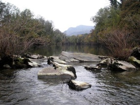 Aufgrund des stark strukturierten, mit Felsblöcken, Steinen, tiefen und flachen Rinnen durchsetzten Flussgrundes kam es natürlich zu einigen Hängern, die - waren sie nicht leicht zu lösen - meinem Guide eine zusätzliche Arbeit aufbürdeten. Beherzt und gekonnt gelang es ihm, auch die hartnäckigsten Fälle dem Felslabyrinth inmitten brausender Fluten wieder zu entreissen. Auf diese Weise verloren wir nur einen einzigen preiswerten Silikonköder, während sämtliche teueren Rapalas gerettet werden konnten.