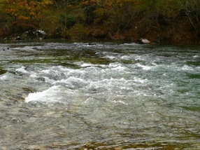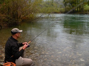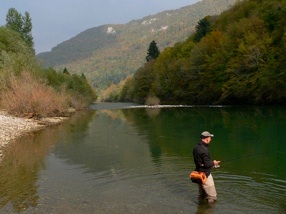 Vom ersten Morgengrauen an fischten wir alle „huchenträchtigen“ und „huchenverdächtigen“ Flussabschnitte, die ich erreichen konnte, sorgfältig ab, Dabei warf ich auf Anraten des Guides den jeweiligen Spinnköder schräg über zum anderen Ufer hin aus, liess ihn die nötige Tiefe erreichen, holte ihn dann, während er mit der Strömung abtreibend die Laufbahn eines großen umgekippten U‘s beschrieb, langsam wieder ein, bis er wobbelnd vor meinen Füßen am eigenen Ufer wieder auftauchte. Aufgeregt, nach jedem Wurf einen Biss oder wenigstens einen Nachfahrer zu erleben, starrten wir in die klaren grünen Fluten - jedoch vergebens!