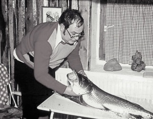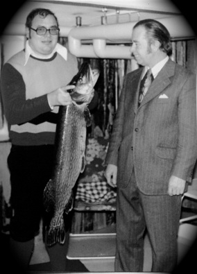 „Das darf doch nicht wahr sein!“ - war der erste Kommentar meiner besseren Ehehälfte, an den sich sofort jedoch die Frage anschloss: “Was machst du denn mit dem?“ Der etwas bange Unterton dabei in ihrer Stimme kam daher, dass sie sich als tüchtige ans Essen Hausfrau sofort vorstellte, sie müsse dieses, für sie als Ungetüm geltende, Wesen in irgendeiner Form kulinarisch zubereiten, was sie sich wohl nicht so recht zutraute. In ihrer ansonsten hervorragenden Küche steht sie nämlich mit Fisch ein wenig auf dem Kriegsfuß. - Indes, ans Essen dieses herrlichen Fisches dachte ich zu diesem Zeitpunkt am wenigsten. dennoch war ihre Frage eigentlich berechtigt. Was machte ich jetzt eigentlich weiter mit „dem“? - Nun, zuerst einmal messen und wiegen natürlich! Endlich wollte ich doch auch in Zahlen wissen, was ich da erbeutet hatte. In meiner Aufregung fand sich zunächst kein Metermaß. Außerdem wuchs in mir ständig der Drang, die Geschichte vom besiegten Hecht weiterzuverbreiten, so dass ich zum Telefon eilte. Dieses stand dann etwa eine Viertelstunde lang nicht still, bis jeder Mitkonkurrent und natürlich auch der Gewässerbesitzer davon unterrichtet war, dass die Jagd zu Ende und Esox gefangen sei. Unglücklicherweise befand sich einer der Informierten gerade bei seinem freitagabendlichen Stammtisch im Gasthaus in der Nähe. Im Nu war unser Hof von Neugierigen überschwemmt. Alles schaute überwältigt und zum teil auch ein bisschen neidisch auf den am Boden liegenden Hecht. Inzwischen hatte sich auch ein Zollstock gefunden, und es wurde wieder und wieder gemessen. Doch das zuerst ermittelte Ergebnis änderte sich nicht: Esox maß genau 101 cm. - Neugierig auf sein Gewicht, brachten wir ihn zur benachbarten Raiffeisen-Genossenschaft, die über eine Dezimalwaage verfügte. Sie stellte unter den kritischen Blicken vieler Zeugenaugenpaare das exakte Gewicht des Erbeuteten fest: 8.800 g! Also 17 Pfund und 300 Gramm! Mit Triumph wurde der so Vermessene und Gewogene anschließend in meinen Angelkeller geleitet und dort auf dem Tisch aufgebahrt. Das Fotografieren konnte beginnen!