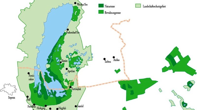 Der österreichische Nationalpark Neusiedler See-Seewinkel wurde 1993 nach langer, gründlicher und mit vielen Schwierigkeiten und Widerständen behafteter Vorbereitungszeit gegründet. Schon seit 1991 bestand auf ungarischer Seite der Fertö-Hanság Nemzeti Park. Das insgesamt mittlerweile rund 300 Quadratkilometer umfassende Schutzgebiet ist somit grenzüberschreitend. Sehr schön kommt das im Logo des Nationalparks zum Ausdruck, in dem die Hälse der dort stilisierten Gänse im unteren Bildbereich sowohl die österreichische als auch die ungarische Flagge bilden.